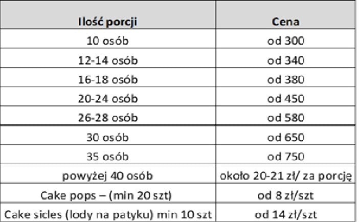 Cena podana w tabelce obejmuje tort okrągły ze standardową dekoracją. Większa i bardziej skomplikowana dekoracja (figurki, topery) podnosi cenę tortu i wymaga wyceny indywidualnej.